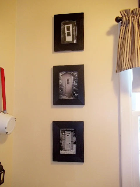 First up - take a trip out to hunting shack country to snap a few black and white photos of real live outhouses. Then - frame them in heavy black wood frames.