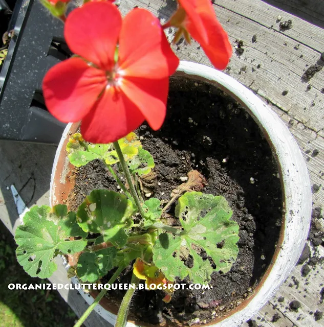 Several of my window box geraniums had been attacked. I purchased $1.49 seed geraniums from Kmart for the window box pots. Normally with a little fertilizer and warm weather, the seed geraniums do well and are quite large by the 4th of July.